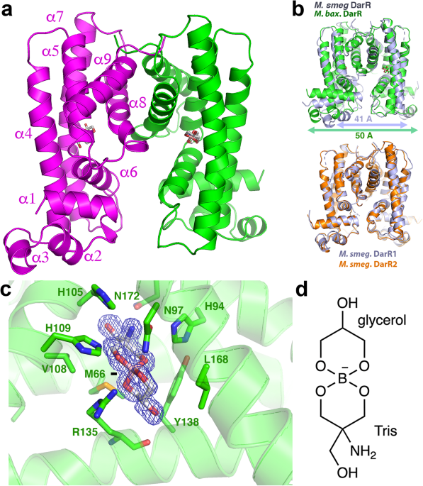 The molecular basis for 2nd messenger binding to the TetR family regulator (TFR), DarR, is unknown. Here the authors obtain DarR structures bound to adenine 2nd messengers and DNA, revealing both a new TFR allosteric binding site and DNA binding mode.