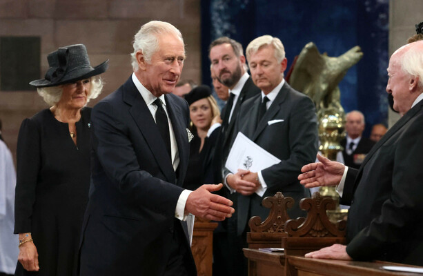 The coffin of Queen Elizabeth II was carried out of St. Giles' Cathedral in Edinburgh on Tuesday to begin her final journey through Scotland to a Royal Air Force plane that will carry her back to London.