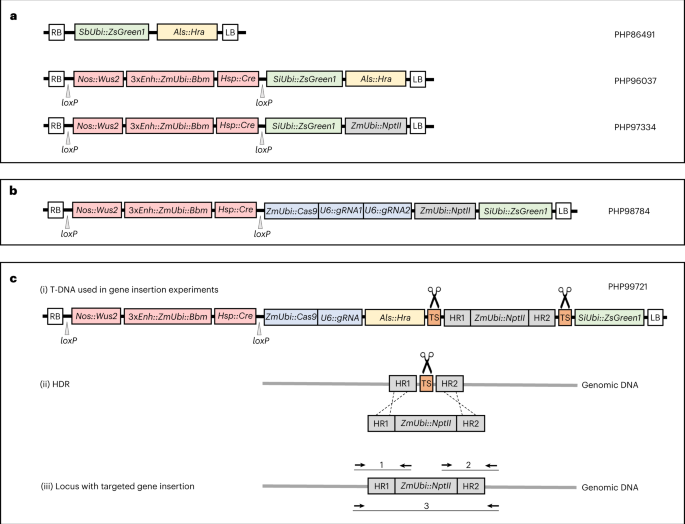 Enhanced Wus2/Bbm expression substantially improves leaf transformation, Cas9-mediated gene dropouts and targeted gene insertion in maize, sorghum and other Poaceae species.