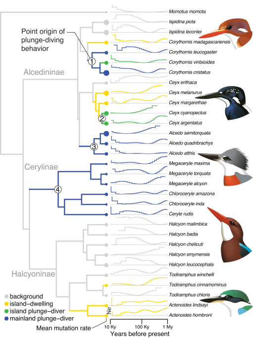 An analysis of 30 diverse kingfisher species identifies genomic signatures associated with their convergent feeding behaviors, including plunge-diving.